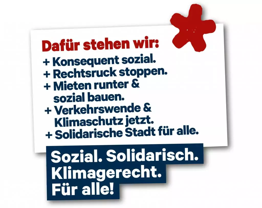 Wir stehen für eine solidarische Stadt für alle. Eine Stadt, die alle mitnimmt – sozial, menschlich, weltoffen und demokratisch. Zusammen mit euch werden wir den Rechtsruck stoppen. Wir stellen und konsequent gegen Rassismus, Antisemtismus, Hass und Ausgrenzung. Wir unterstützen die Arbeit antifaschistischer und migrantischer Organisationen vor Ort. Wir sehen uns als Teil der Friedensbewegung und lehnen Krieg und Gewalt ab.